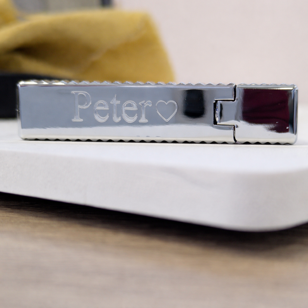 Maak deze aansteker extra bijzonder met een persoonlijke gravure van maximaal 15 karakters. Denk bijvoorbeeld aan een naam, datum of initialen. De gravure wordt stijlvol in de zijkant van de aansteker geplaatst — subtiel, maar met een luxe uitstraling. Heb je voorkeur voor een ander lettertype dan de getoonde opties? Vermeld dit dan gerust in het opmerkingenveld aan het einde van het bestelproces.