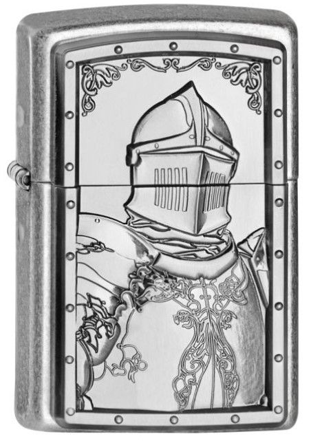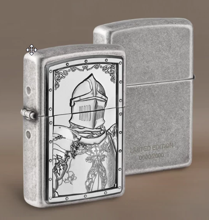 Deze Zippo aansteker heeft een antiek zilver afwerking met aan de voorzijde een embleem, waarop een ridder te zien is. Dit is een gelimiteerde uitgave van 2000 stuks, waarvan de nummering op de achterzijde van de Zippo is gegraveerd.